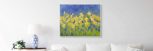 I wanted to paint daffodils — a flower that so strongly represents spring. The vibrant contrast of yellow and blue gave the painting its energy and fresh character.
